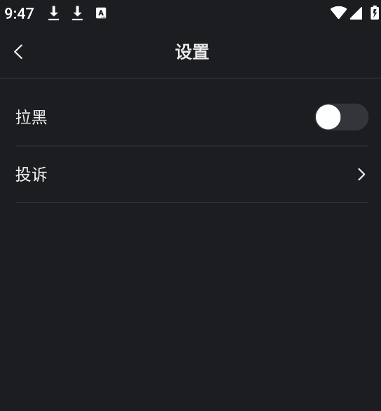 6、可以看到有拉黑和投诉两个选项,拉黑后面的按钮开启即可。