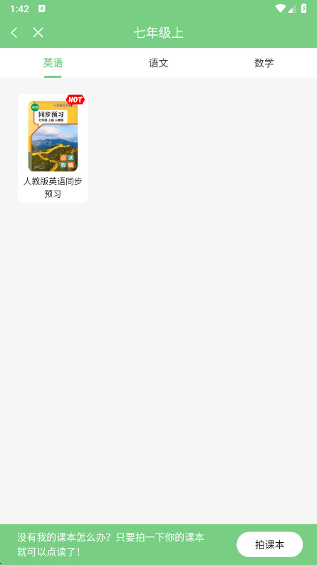 4、若里面没有你要的课本可以点击拍课本功能,然后将课本放平,保证课本页面边缘和绿色方框吻合,然后点击拍照就可以点读啦