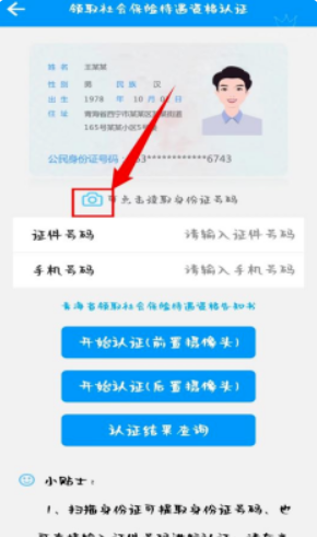 3.点击“相机”读取身份证号码或手动输入证件号码、手机号码;