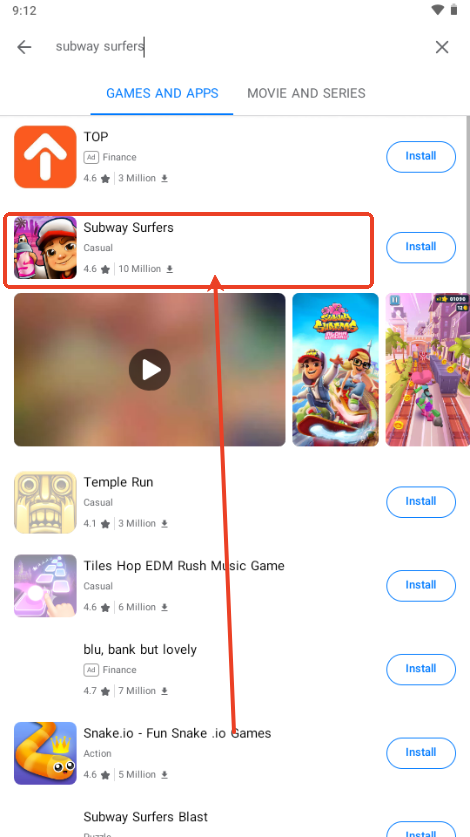 3、这里以地铁跑酷为举例,我们输入Subway Surfers;