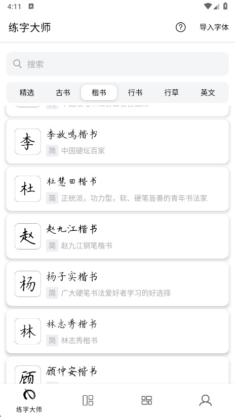 1、在App的首页就能看到,它有楷书、行书、行草、古书、英文五大类文体,关键是每个类别下又有N多种不同风格的字体。