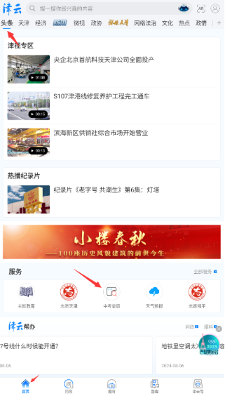 1、下载津云app打开软件,在首页板块点击头条往下拉看见中考录取;