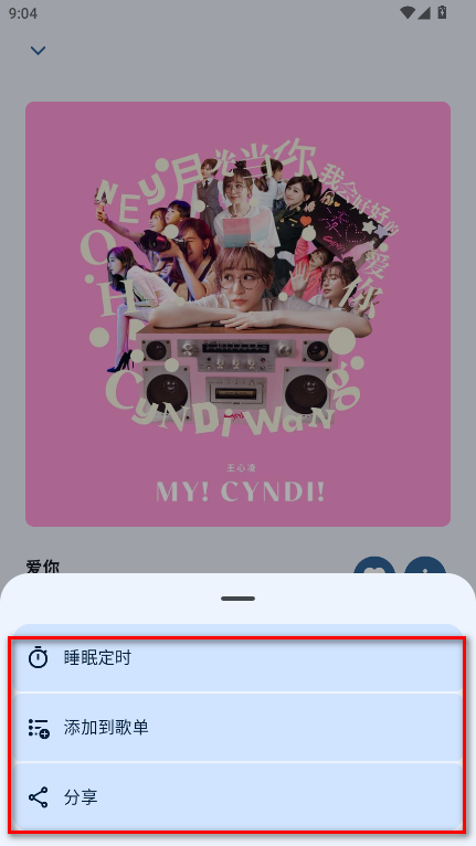 7.可以看到本软件支持睡眠定时、添加到歌单、分享等功能。