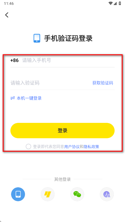 3.先输入手机号和验证码,勾选登录即代表您同意用户协议和隐私政策,再点击登录即可。