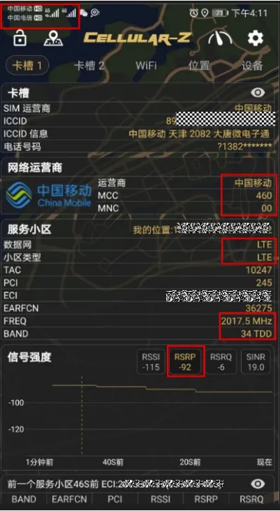 软件界面显示RSRP值,-92表示信号一般,能满足通话和上网需求。