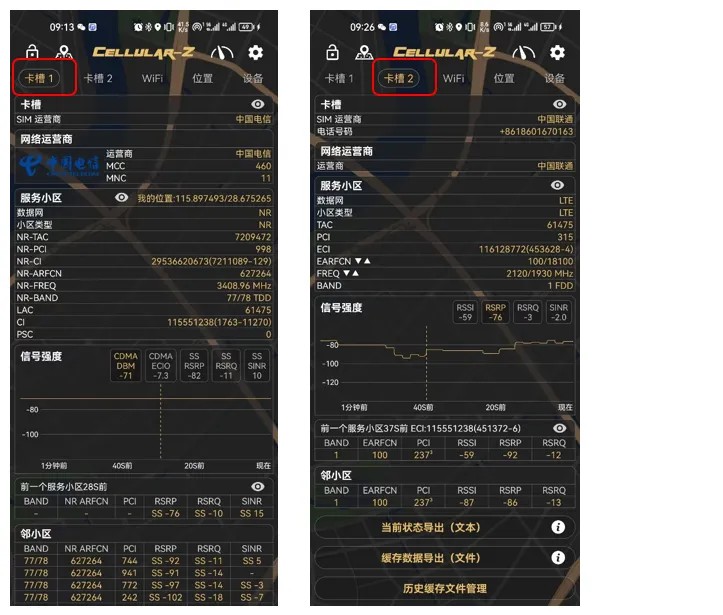支持双卡手机同时显示两张SIM卡的网络状态,通过选项卡切换查看不同卡槽信息