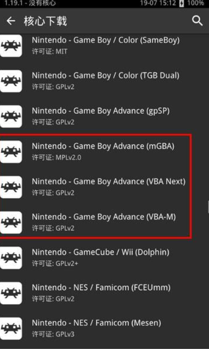 4、下载完后RetroArch会自动解压核心,我们返回游戏选择核心页面选择GBA核心。