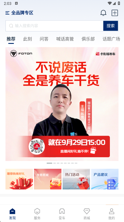 福田e家App是福田汽车为广大卡友打造的数字化服务平台,集车型选购、车友交流、用车服务、积分商城于一体。用户可随时查看热销车型优惠信息,在车友圈分享货源、获取专家解答。车联网功能让您实时掌握车辆动态,保障出行无忧。更有会员积分商城,商品秒杀、会员日活动不断,福利多多,实用又省钱,让卡友享受一站式智慧出行与生活服务。