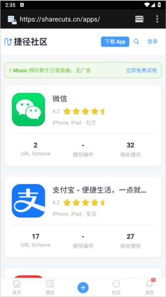 6、不知道URL Scheme 的链接可以在左上角的“捷径社区”中查找。也可以在搜索引擎搜索 App 名称 + URL Scheme 尝试寻找。