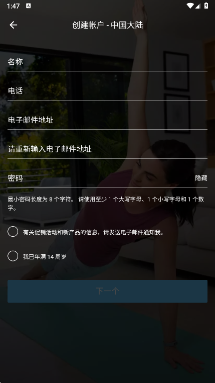 1、进入app,选择中国大陆区域,然后点击创建账户