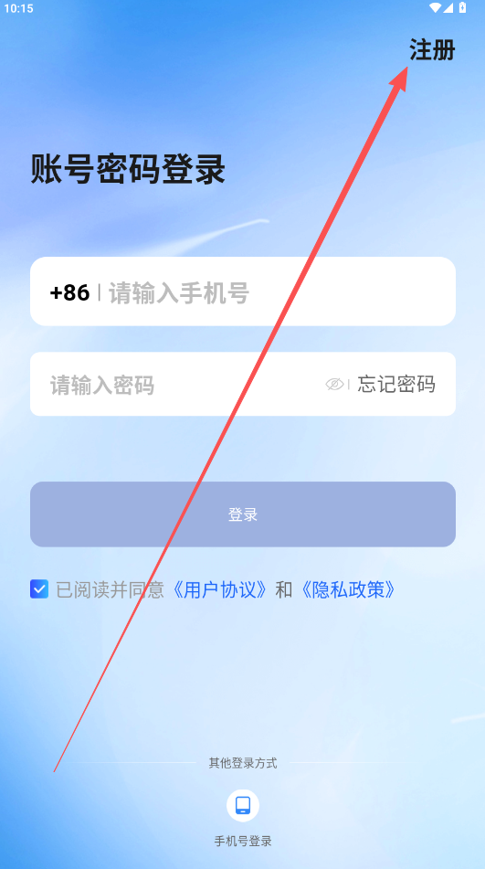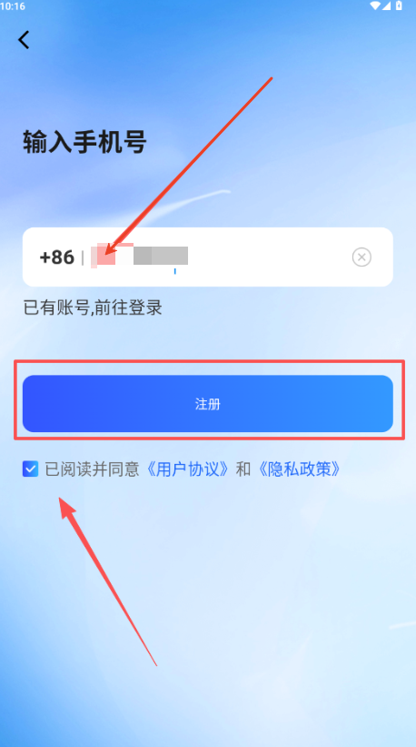 2、输入使用者手机号码,点选下方的用户协议和隐私政策“注册”。
