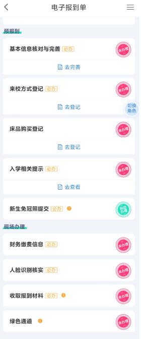 6、进入天财微校园后,点击底部“服务”进入新生服务分类下的“新生报到”应用,按照报到单流程进行办理。