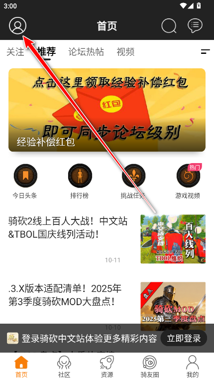 1、打开骑砍中文站,点击左上角的头像。