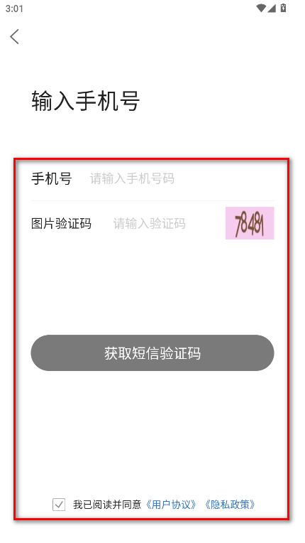 4、请输入手机号码、验证码,点击获取短信验证码,勾选我已阅读并同意《用户协议》《隐私政策》,接着按照软件的提示操作即可注册成功啦。