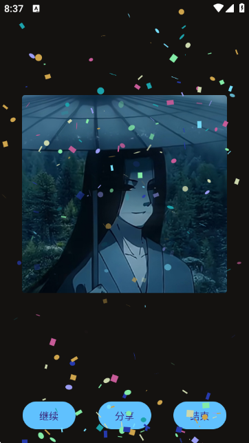 编辑完成后,可选择“继续”编辑、“分享”作品或“结束”操作。