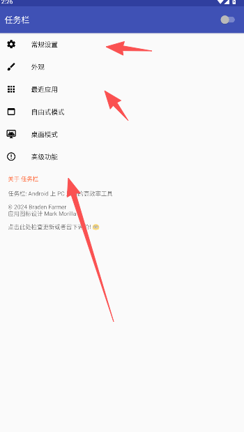 1、任务栏taskbar功能展示部分以:常规设置、外观、最近应用、自由式模式、桌面模式以及高级功能等部分组成。
