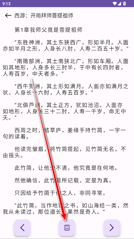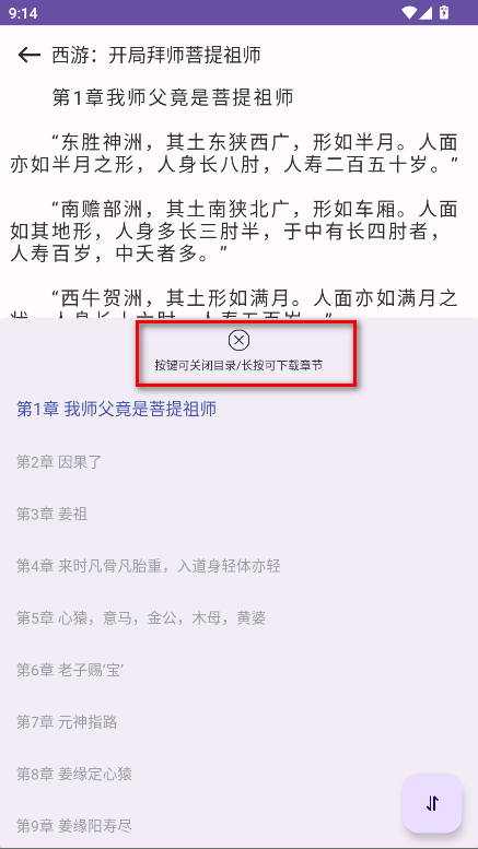 7.如下图所示,按键可关闭目录/长按可下载章节。