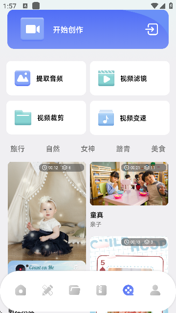 8、而且软件中还提供了视频剪辑功能,如图所示,这类可以进行简单,基础的视频处理,例如裁剪,变速,添加滤镜,提取音频等,而且还有丰富的模板资源可以使用。