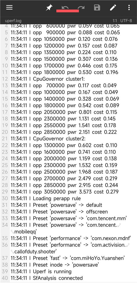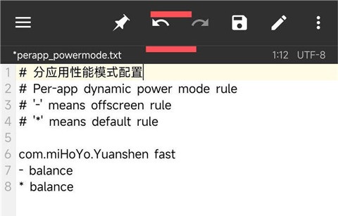 一、用mt管理器打开此路径/storage/emulated/0/Android/yc/uperf/perapp_powermode.txt,如图二,“#”号后面为注释,下面为设置“包名空格模式”,作者已经默认设置原神为极速模式,<powersave(省电),balance(均衡),performance(性能),fast(极速)>,可以根据自己的实际情况设置,最下面的“-”为息屏需要开启的模式,“*”为默认模式,两个都可以自己设置模式,设置好之后保存即可