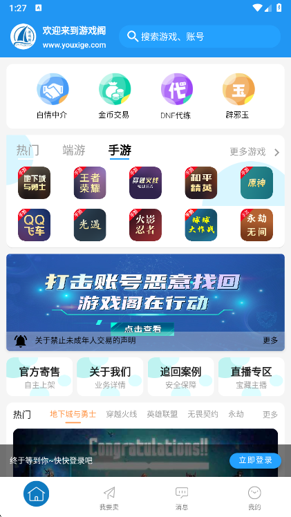 游戏阁账号交易是一款专业的游戏交易平台,旨在为玩家提供安全、便捷的账号交易服务。平台支持各种热门游戏账号的买卖、租赁以及道具交易,确保交易过程透明公正,保障双方权益。无论是想出售闲置账号,还是购买高等级、稀有道具的玩家,游戏阁都能提供一站式解决方案,帮助玩家更好地享受游戏乐趣。