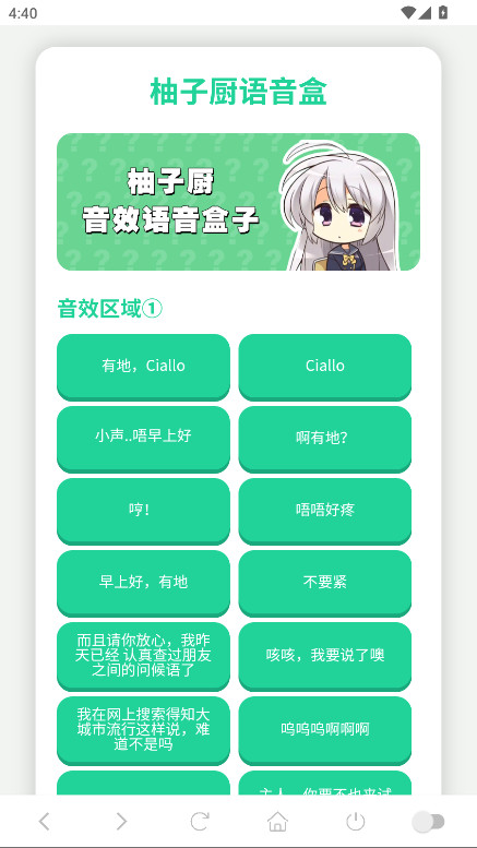 柚子厨语音盒app闪现啦,在这个语音盒里,你可以轻松找到并播放你最喜欢的经典角色台词,就像随时点播自己专属的广播剧;你也可以把那些充满元气和可爱的“Ciallo~”声音设置成提醒,就像拥有了一个独一无二的手机闹钟;你还可以把有趣的语音片段分享给你的朋友,就像和大家一起分享二次元的快乐小秘密。它操作起来非常简单,你只需要点一点、按一按,就能找到想要的声音;它的界面设计很干净,让你能把注意力都放在那些可爱的声音上;它能让你在学习累了或者心情不好的时候,瞬间听到那些治愈又温暖的声音。