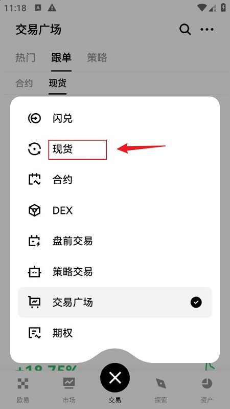 1.进入APP主界面,在首页中点击页面下方【交易】- 选择现货
