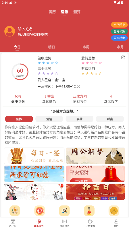 365小时光是一个功能丰富的生活服务平台,专为用户提供黄历运势查询工具。它不仅有每日运势分析、黄历宜忌,还能帮助用户了解个人生肖、五行、吉凶方位等信息,助力决策和规划生活。此外,365小时光还提供健康、日程管理、天气预测等功能,全面优化您的生活方式,成为您日常生活中的得力助手。