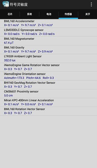 符号灵敏度app可以实时监测手机的陀螺仪数据,实时显示设备的加速度信息,实时记录环境的光照强度与磁场变化,将手机变为一个高精度的物理探测仪;它能够详细展示每一个传感器的灵敏度指标,详细提供各项数据的变化曲线图,详细分析传感器可能存在的偏差或故障,帮助你进行专业的硬件诊断;它致力于让你了解手机硬件的运行极限,让你发现潜在的性能瓶颈,让你根据数据做出合理的优化调整,实现手机潜能的最大化发挥;它将抽象的硬件参数变得可视化,将隐藏的系统数据变得可读化,将复杂的专业诊断变得简单化,成为技术爱好者和专业用户的得力助手。