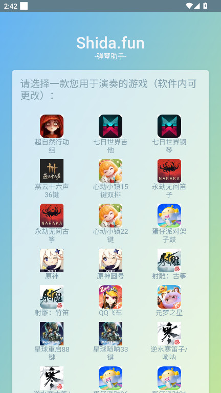 初次打开软件会跳转到选择游戏界面,在该界面选中您用于演奏的游戏乐器就可以了(后续可以在软件内更改)
