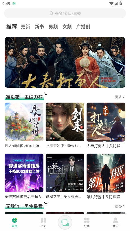 1.请在本站下载安装并打开小梨听书,可以看到首页上方有着推荐、最新、新书、男频、女频、广播剧等板块内容。