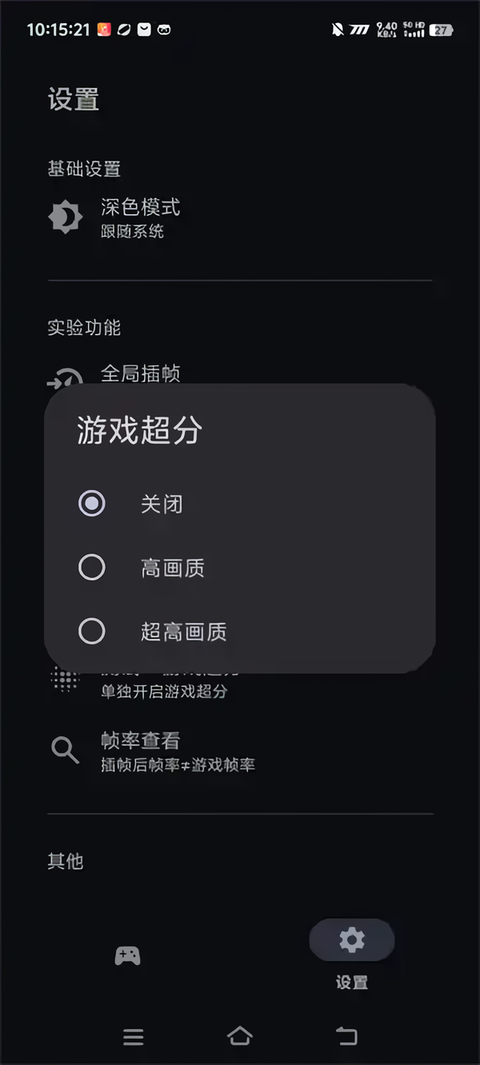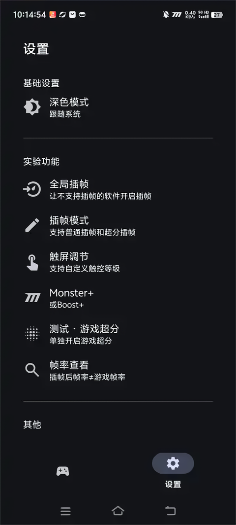 2、导入游戏后选择合适的功能,比如说:全局插帧、插帧模式、触屏调节、Monster+、测试游戏超分、帧率查看等;