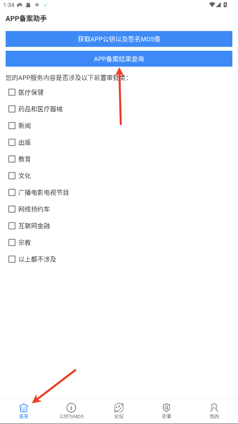 1.打开APP备案助手,点击主界面上的“备案”模块。点击app备案结果查询