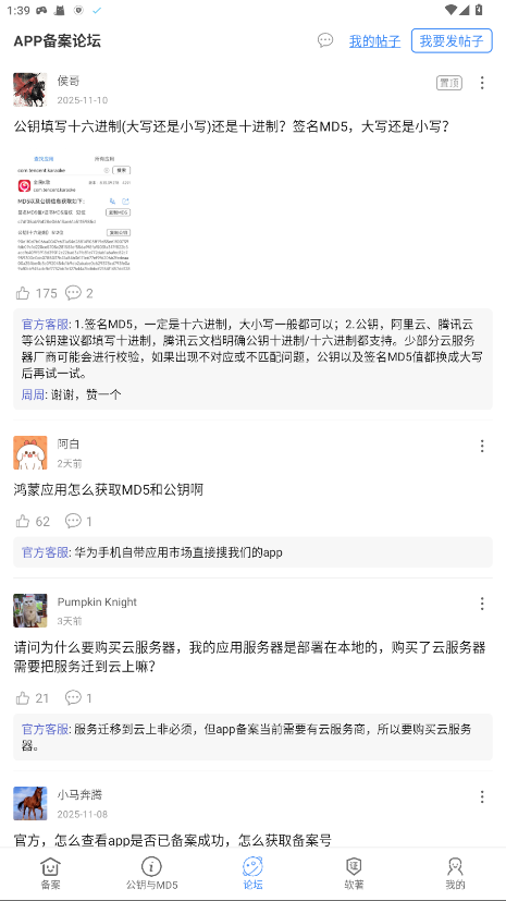 5.进入“论坛”模块,查看其他开发者的讨论和经验分享。提出你在APP备案过程中遇到的问题,向其他开发者请教。