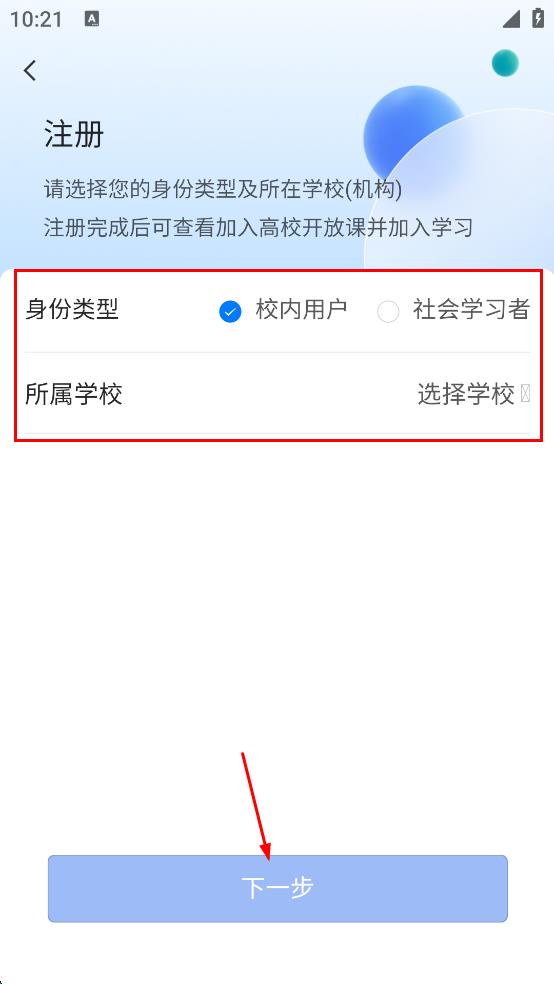 4、在注册页面,选择身份类型,若为校内用户则勾选,然后选择所属学校,完成后点击“下一步”,按照后续提示完成注册流程。