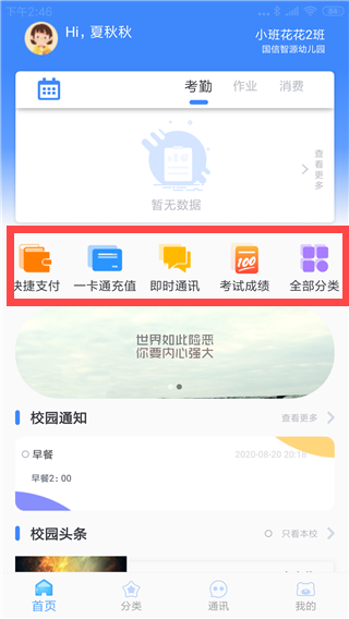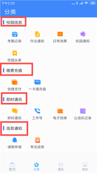 2、进入分类界面,这里宛如一个校园信息与服务的宝库,可查看校园信息、缴费充值、即时通讯、信息通知等板块,获取校园动态与服务。