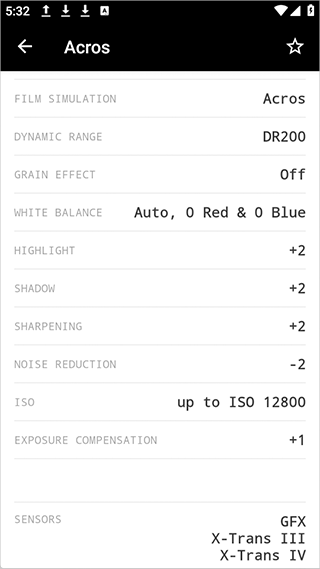 2、App会显示该配方所需的所有设置(如:胶片模拟、白平衡、DR、高光、阴影、颗粒效果等)。