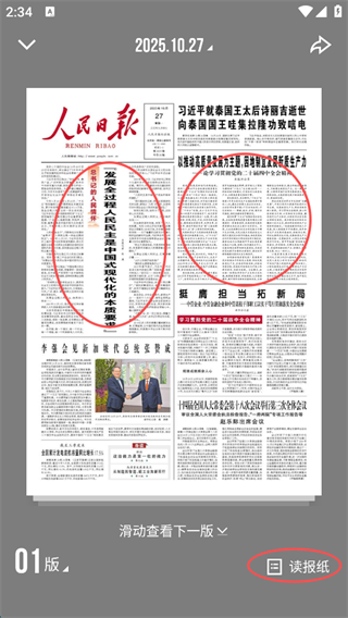 2、就可以看报纸了,想要看哪一个板块,可以直接点击进入,或者点击屏幕右下角的“读报纸”。