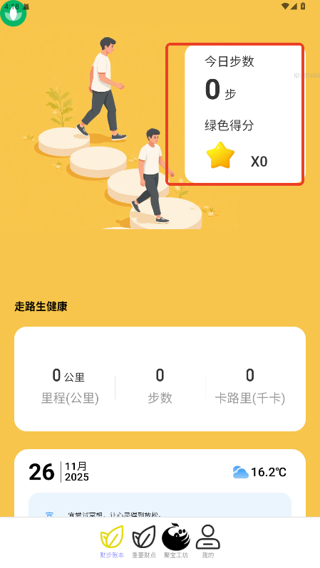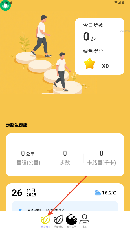 1.进入 “财步账本” tab,可实时查看系统精准记录的当日步数、行走里程及消耗的卡路里数据。