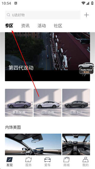 1、打开引力域软件,点击专区标签,可查看第四代逸动等车型展示,了解车型参数配置等信息。