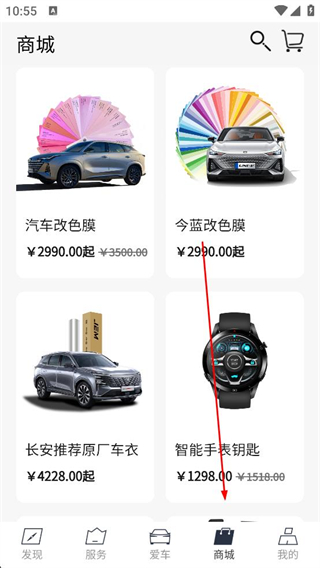 4、点击商城选项进入商城页面,可查看汽车改色膜、智能手表钥匙等商品,选择心仪商品进行购买。