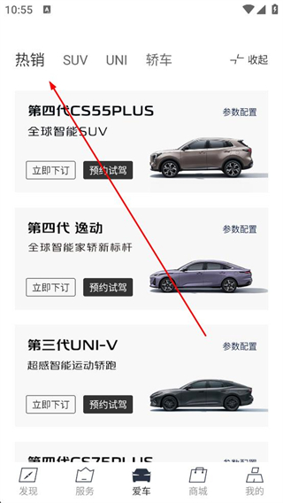 3、在车型展示区域点击热销标签,可查看第四代CS55PLUS、第四代逸动等热销车型,选择预约试驾或立即下订。