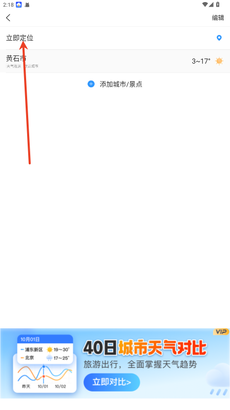 2.点击界面左上角 “+” 按钮,进入地区管理页面,输入目标城市或景点名称,即可添加该地区天气并随时切换查看。