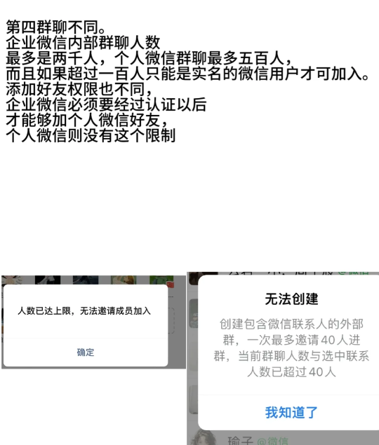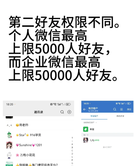 添加好友权限也不同,企业微信必须要经过认证以后才能够加个人微信好友,个人微信则没有这个限制