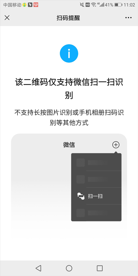 但是如果用户没有其它手机设备时,平板上的微信也不支持扫码功能,是不能扫码登录的,即使将二维码截屏保存下来打开微信进行反向扫码,也是没有的,因为该登录二维码是不支持反向扫码的,小编手机经过验证后得到如下页面