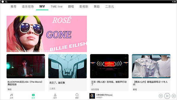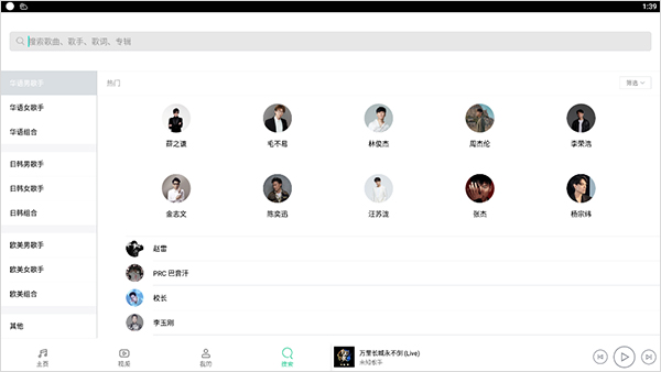 3、或者在搜索页面中,通过顶部搜索框或按歌手分类进行搜索歌曲进行播放