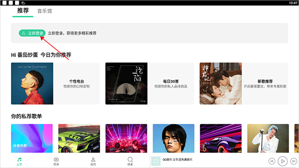 1、用户打开并登录软件,进入主页后可以点击软件每天推荐的歌曲进行播放