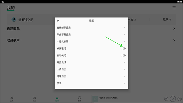 2、在弹出的设置选项中点击下图所示的桌面歌词右侧的开启按钮