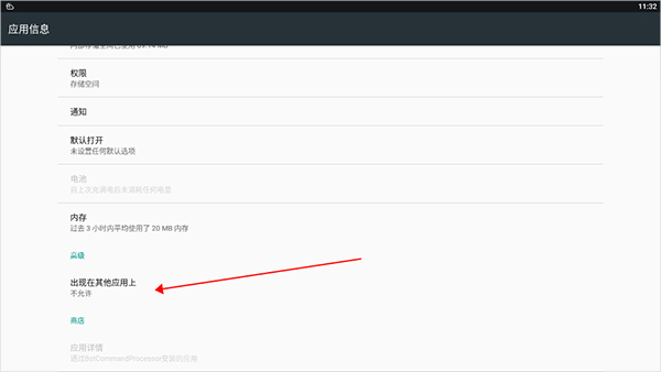 4、在打开的新页面中,下拉页面至【高级】处,点击【出现在其他应用上】(下图红色箭头所指区域)
