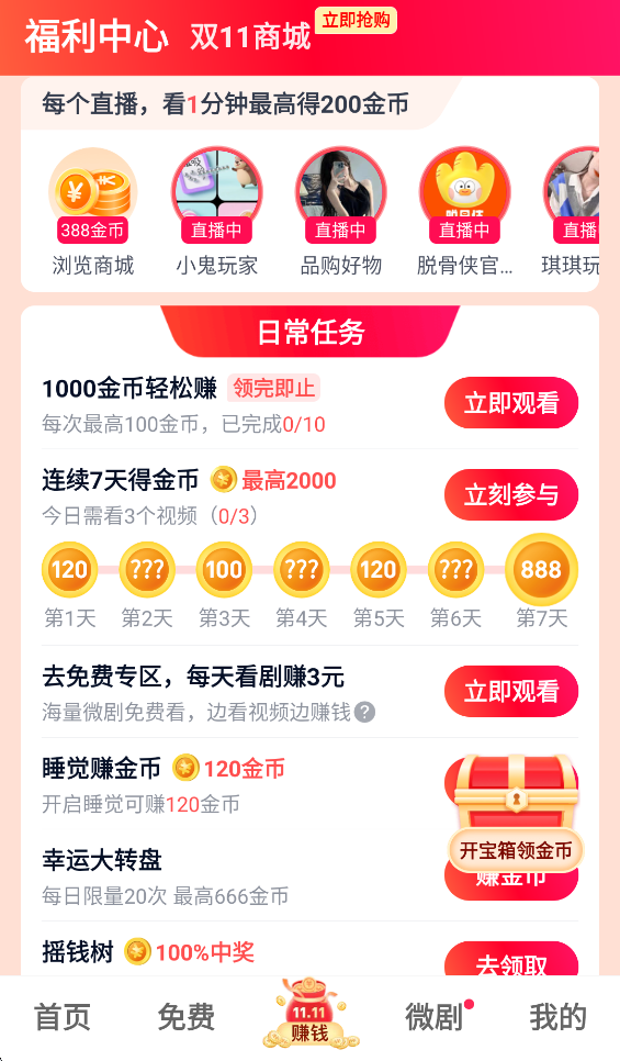 1.首先我们来到下方中间【赚钱】的界面,可以看到这里不仅能领红包,还能获得金币。