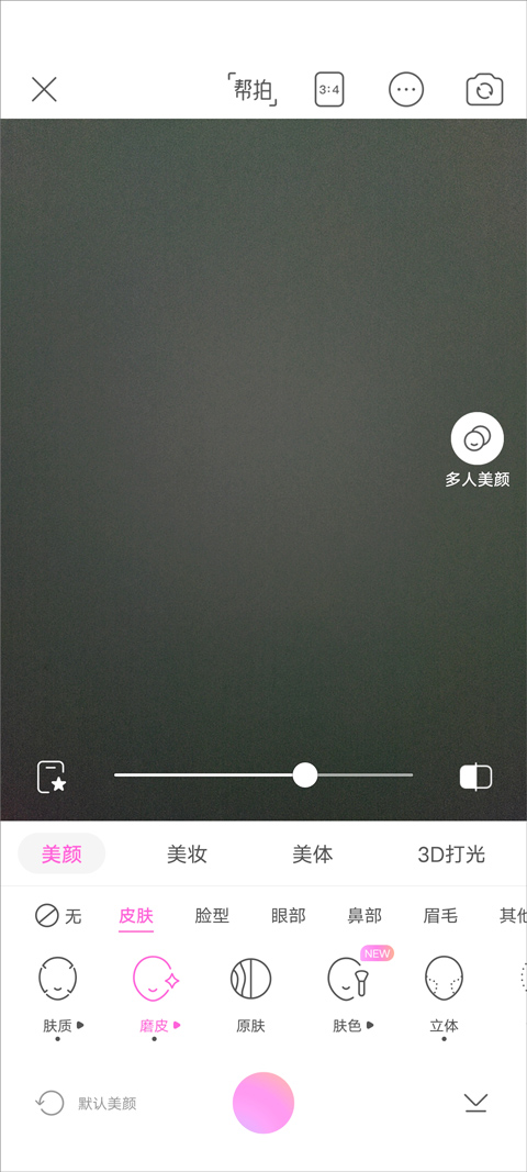 1、打开美颜相机后,里面有【美颜】【美体】【补妆】,点开【美颜】把里面的磨皮,肤色,瘦脸,大眼,瘦鼻,黑眼圈等选项,都调到比例为10到20就可以,不要过于夸张。